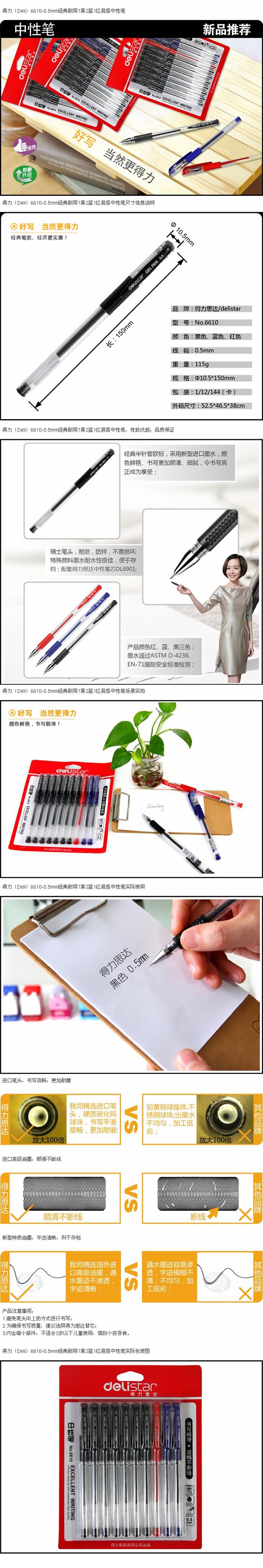 - 商品名称:得力6610经典耐用7黑2蓝1红混搭中性笔 0.5mm<黑色>10支卡装