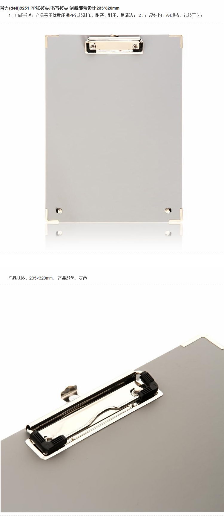 - 商品名称:得力 9251 PP纸板夹/书写板夹 A4(235*320mm)<灰色>
