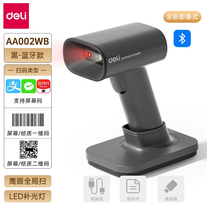 - 商品名称:得力AA002WB条码扫码枪一二维码条形码扫码器无线+蓝牙 灰色