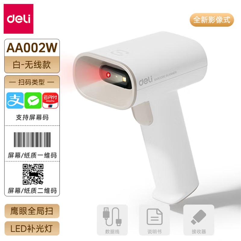 - 商品名称:得力AA002W条码扫码枪一二维码条形码扫码器无线 白色