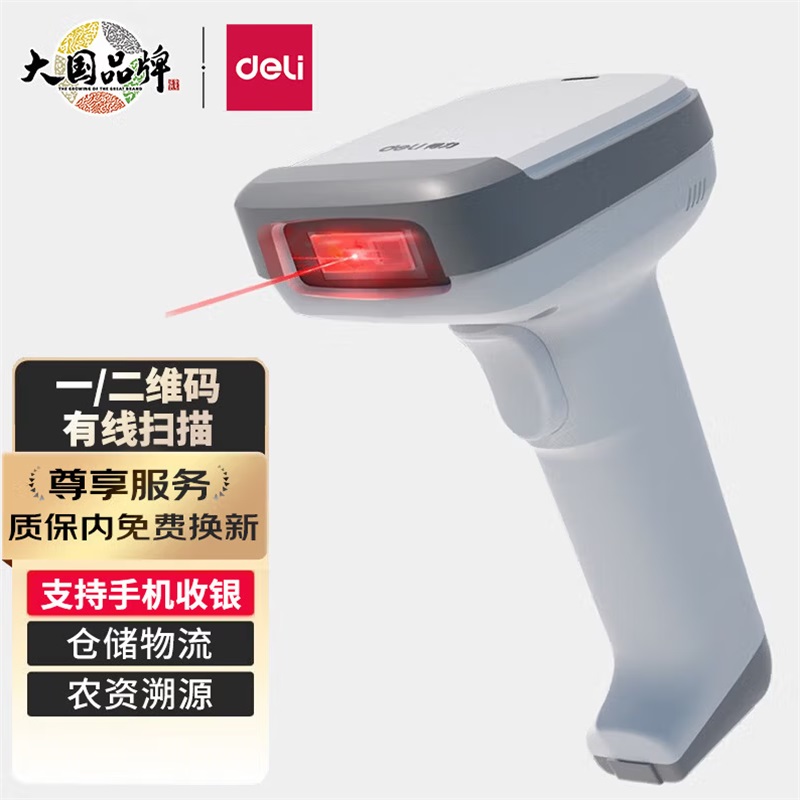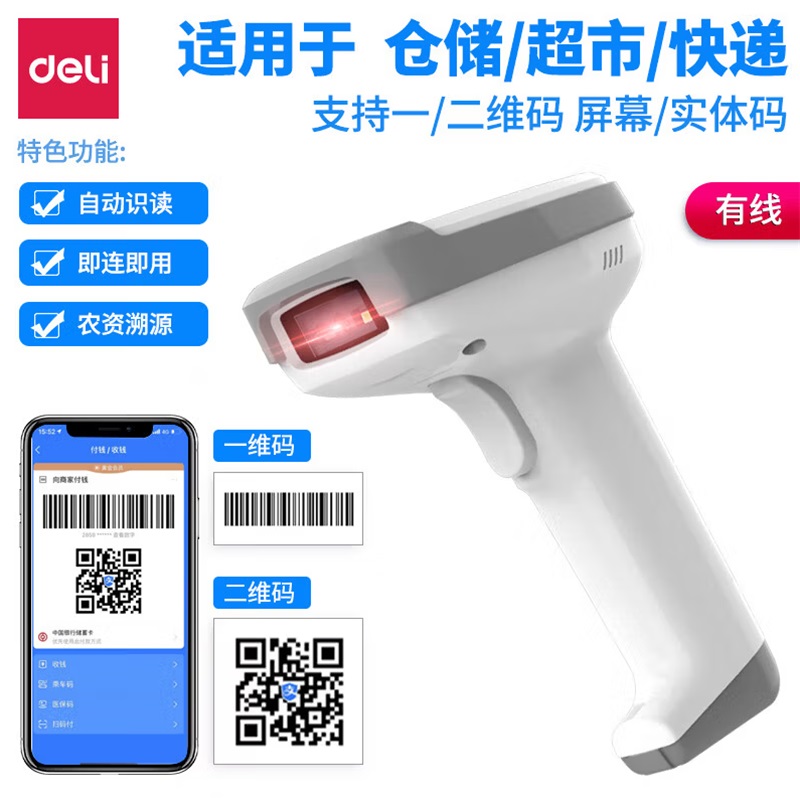 - 商品名称:得力14952扫码枪扫描枪一二维商超仓储扫描手机屏幕收 有线 白色