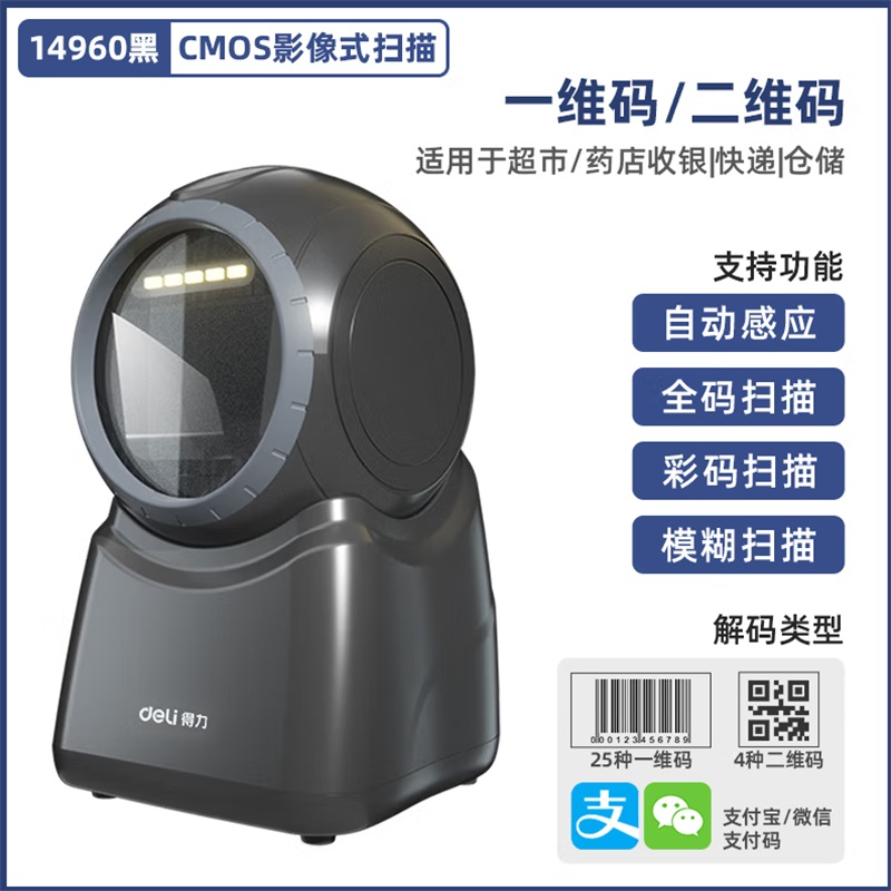 - 商品名称:得力14960扫描器扫描枪手机支付扫码盒子二维码平台扫码器 黑色