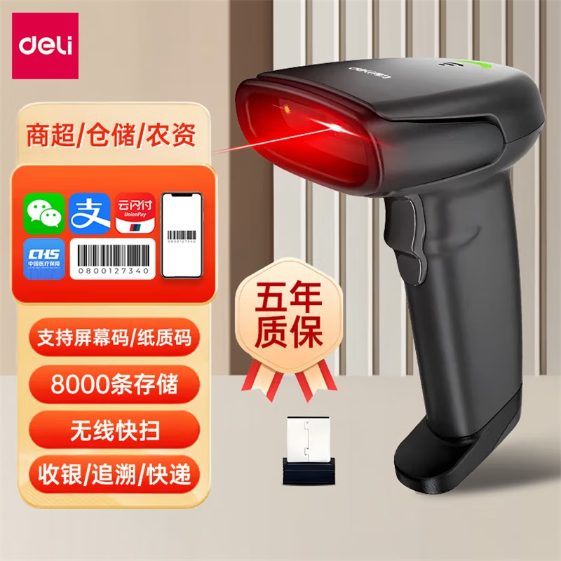 - 商品名称:得力AA102条码扫描枪一维屏幕码扫描器无线 黑色