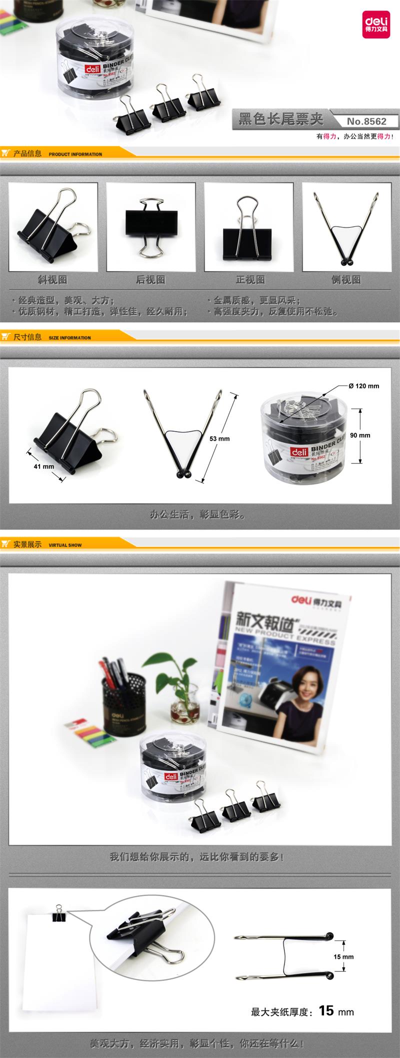 • 商品名称:得力 2#黑色长尾票夹41mm(筒装/黑色)