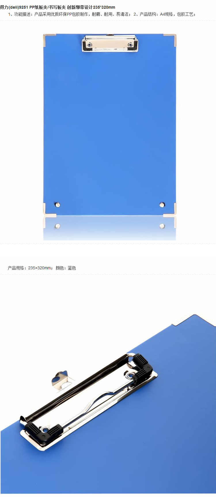 - 商品名称:得力 9251 PP纸板夹/书写板夹 A4(235*320mm)<蓝色>