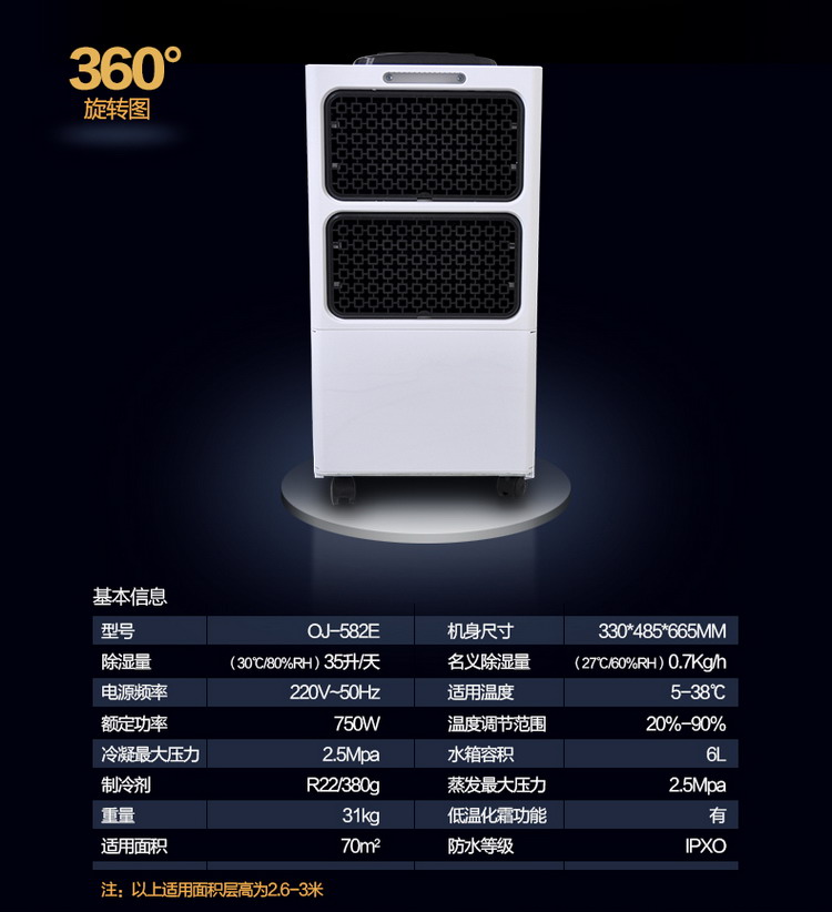 欧井OJ-582E家用除湿机适用面积:15㎡-70㎡,机身尺寸:335×485×665mm,电源频率:220V~50Hz,额定功率:750W 额定电流:3.5A,日除湿量(L/24h 30℃/RH80%):35L/D。